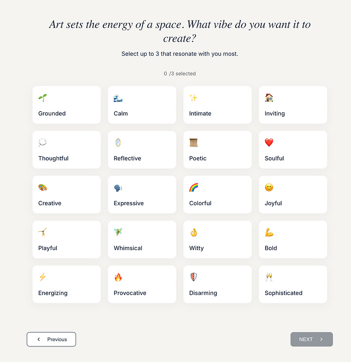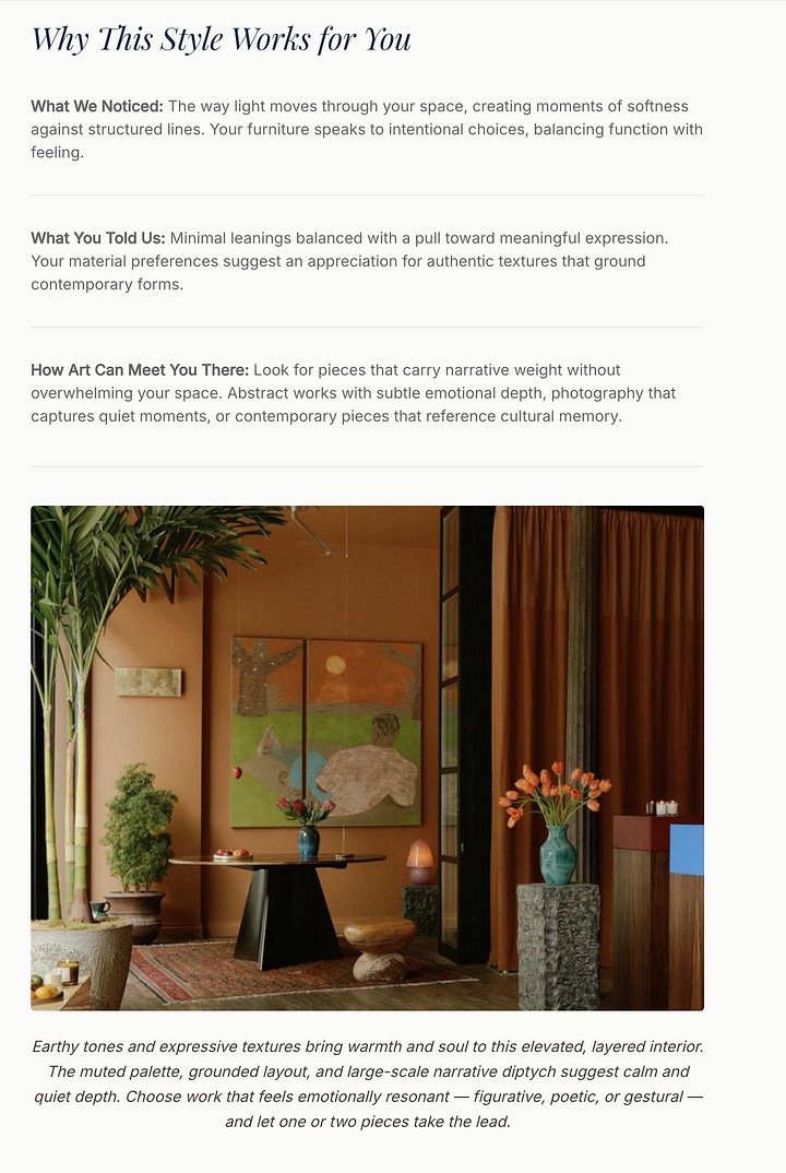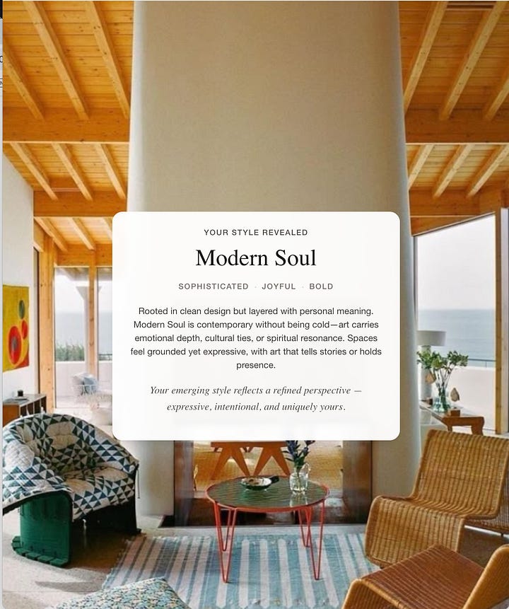 Under the hood, LOTA’s Art Match Tool uses AI. It analyzes your responses and images to help make connections you might not see on your own. AI makes people nervous, rightfully so, but we all also know there are a ton of benefits to it too. I don’t believe it can replace taste, vision, or intuition, but it can help pattern match. That’s all it’s doing here.